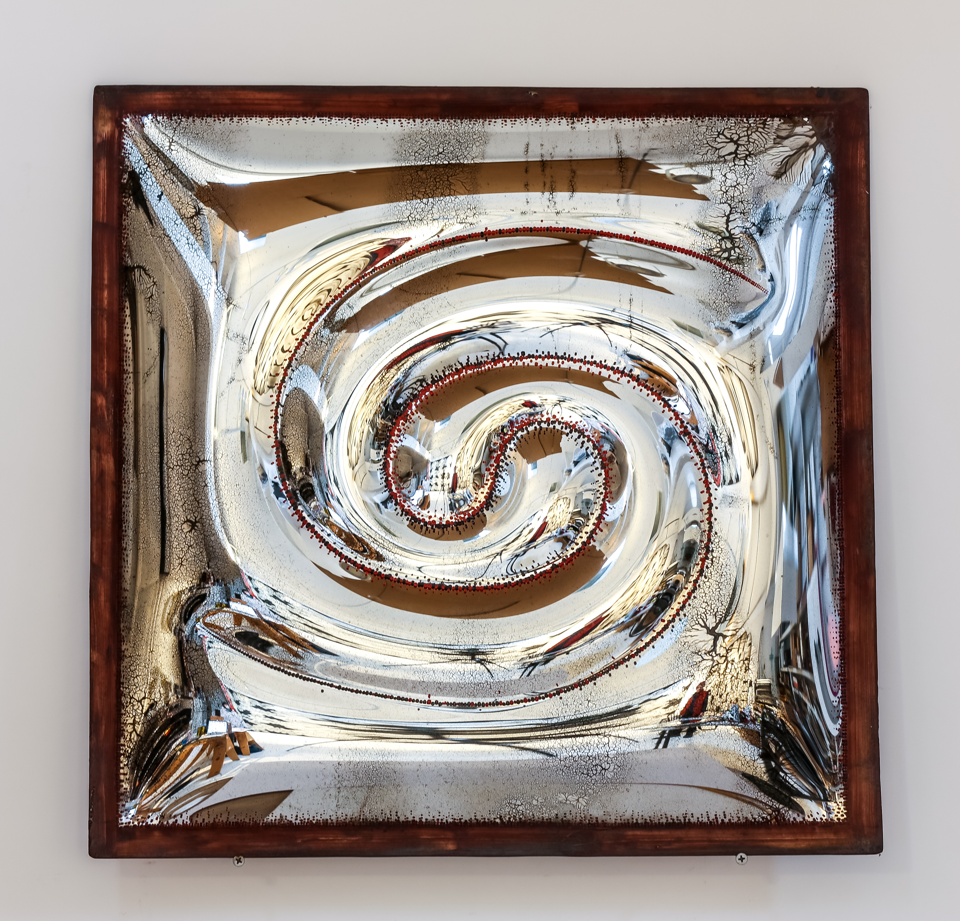 In 1969, Cash had rented part of the White St Glass and Mirror factory space to be able to bend sheet glass and produce “image-distorting mirrors”. Cash did a performance piece, wearing mirror sandwich boards. He walked around reflecting people’s images back at them. It was written about in The Daily News article on the first earth day. Within the year, the overcooked “mistakes” became more interesting than the mirror forms. At that point, Cash started paying attention to making three-dimensional structures, transforming sheet glass into self-supporting forms over fine nichrome wires. This was the beginning of bodies of work that continued until the next century.